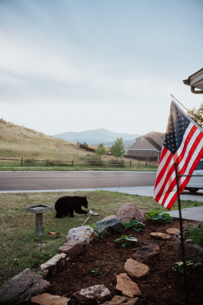 A mean-ol-bear demolished, dismembered, and destroyed my bird feeder pole and the two bird feeders hanging on it while I watched through my window. Dusk was just at it’s beginning when I plopped myself on the couch after getting kids to bed and glanced outside to this. The bears can be active in our area (we do live near open space) but they often do so in the middle of the night (as we have seen in countless doorbell camera videos!) This one however was ballsy and brave and enjoyed his dinner in the light of the day. We did scare him away but not in time to save anything.