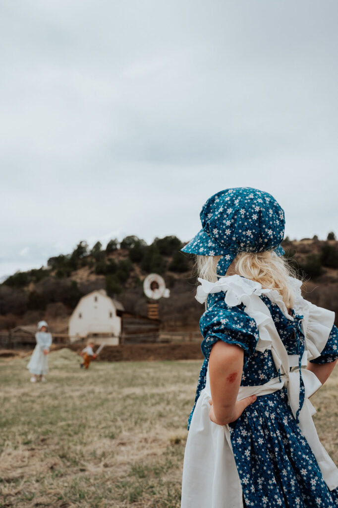 Mother Millie. Are you even a homeschooler if you don’t dress up in your pioneer costume and go to historical landmarks in town?! Rock Ledge Ranch is one of our favorite places on earth (it is near and dear to our hearts for so many reasons) and the kids were thrilled to wear their outfits to the ranch. This photo I took feels like a bridge between the future and the past, childhood and motherhood. My middle child looking so motherly as my other two pose (or play) in the background. I entered this photo into a gallery and titled it “A Mother’s Gaze.”