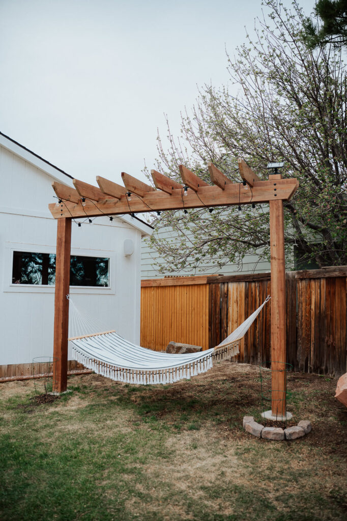 Bruce built me a pergola for my hammock! I bought this pretty hammock from Target years ago thinking it could fit on my porch in a certain spot. After some time, I realized it wouldn’t work where I first envisioned but was way past the return window (emphasis on “some time”!!) So this beauty sat folded up in the garage collecting dust (literally wood dust from all Bruce’s woodworking projects), until that same man gave me an early birthday gift! We planted grape vines right afterwards and they grew like crazy over the summer!